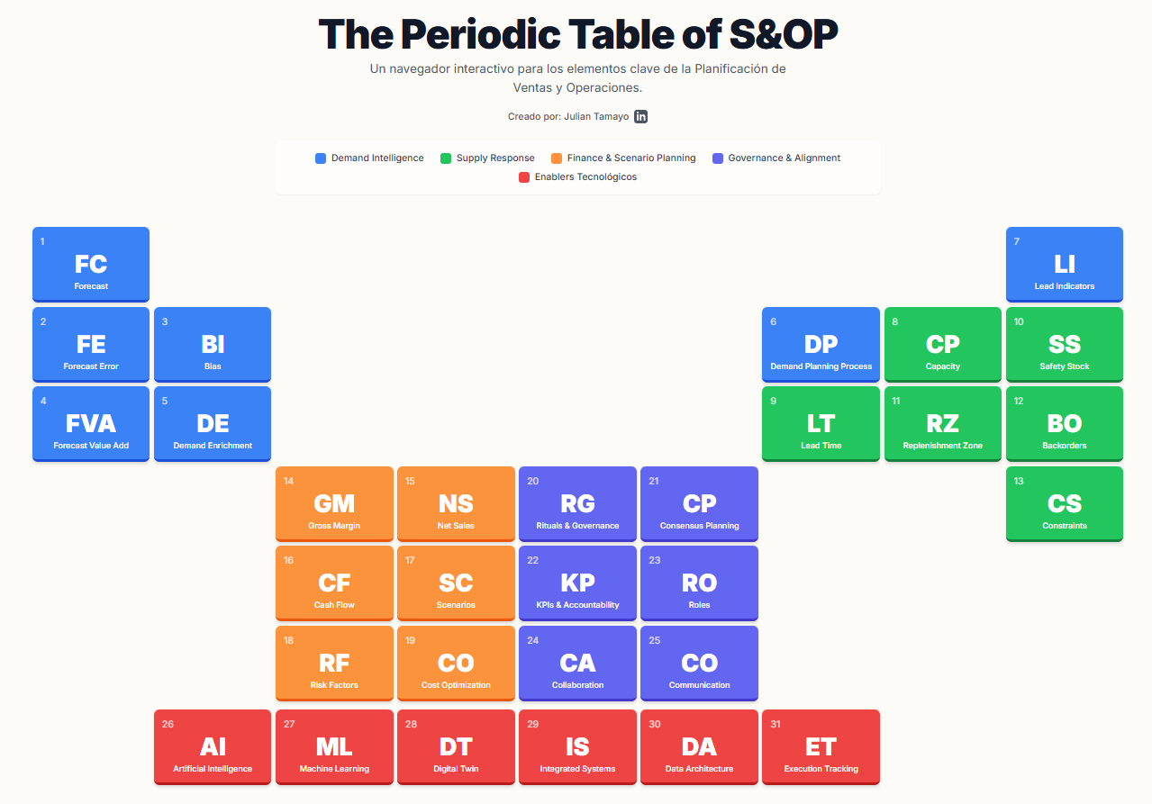 Por eso creé la Tabla Periódica Interactiva del S&OP, una aplicación que convierte los 30 elementos críticos del Sales & Operations Planning en una experiencia visual y práctica.